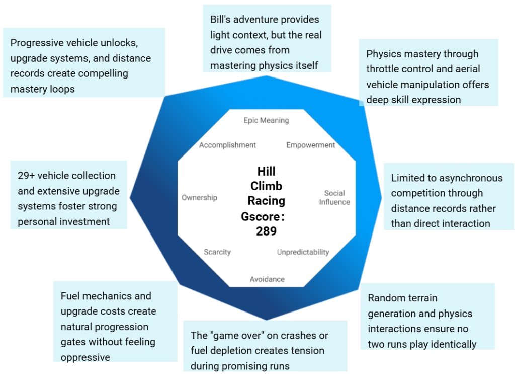 Accomplishment | 8 | Progressive vehicle unlocks, upgrade systems, and distance records create compelling mastery loops |
