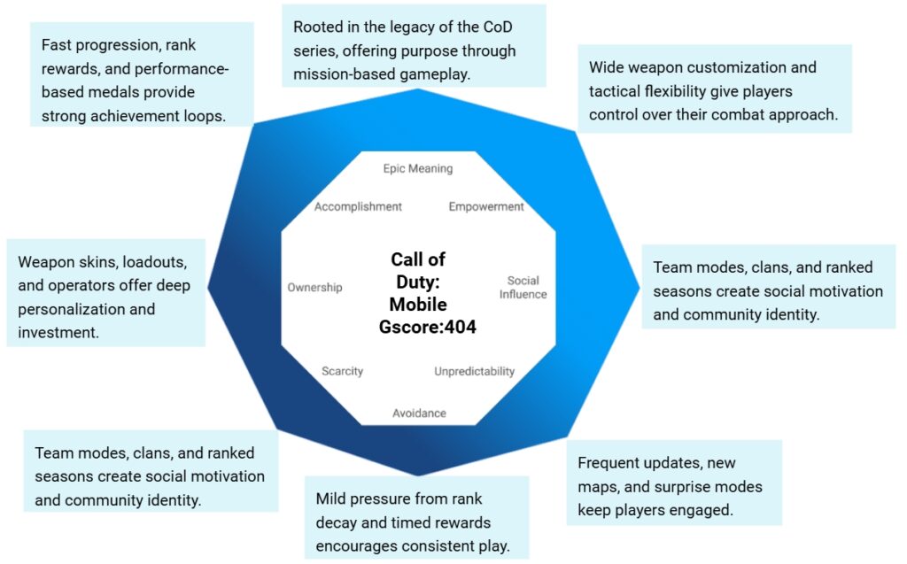 Call of Duty: Mobile masterfully combines intrinsic motivation (skill mastery, empowerment) with extrinsic rewards (ranks, cosmetics, achievements).