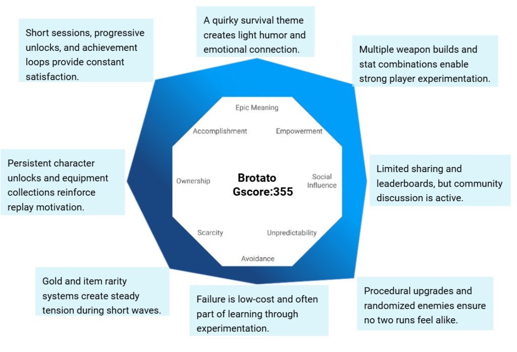The radar chart shows that Brotato strong emphasis on Accomplishment and Empowerment, forming the game’s addictive loop foundation