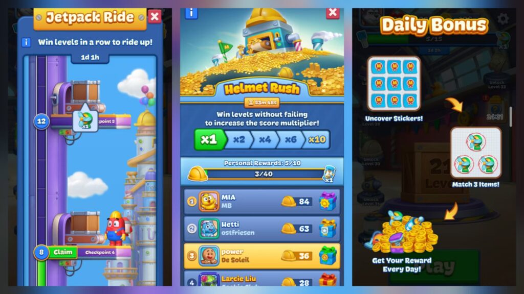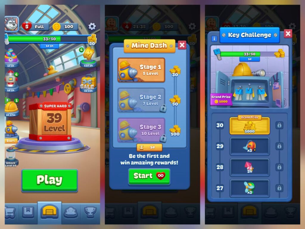 • Multiple objectives: Besides the main levels, there are various events like “Mine Dash,” “Helmet Rush,” and “Key Challenge,” each with its own stage goals and rewards.