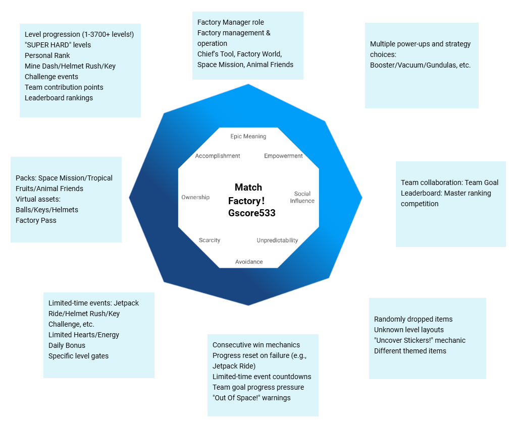 Match Factory! is more than just a match-3 game; it’s a comprehensive gaming platform that deeply integrates strategy, collection, social features, and competition. Its Octalysis radar chart resembles that of a perfectly balanced “all-rounder,” excelling particularly in motivating long-term player investment and forming daily habits.