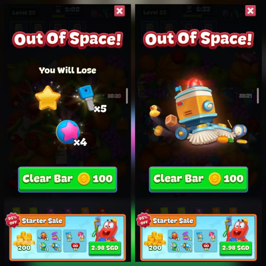 • Resource Crises: When the “Out Of Space!” prompt appears, if you don’t deal with it (e.g., watch an ad or pay), you might not be able to continue—a mild form of loss aversion design.