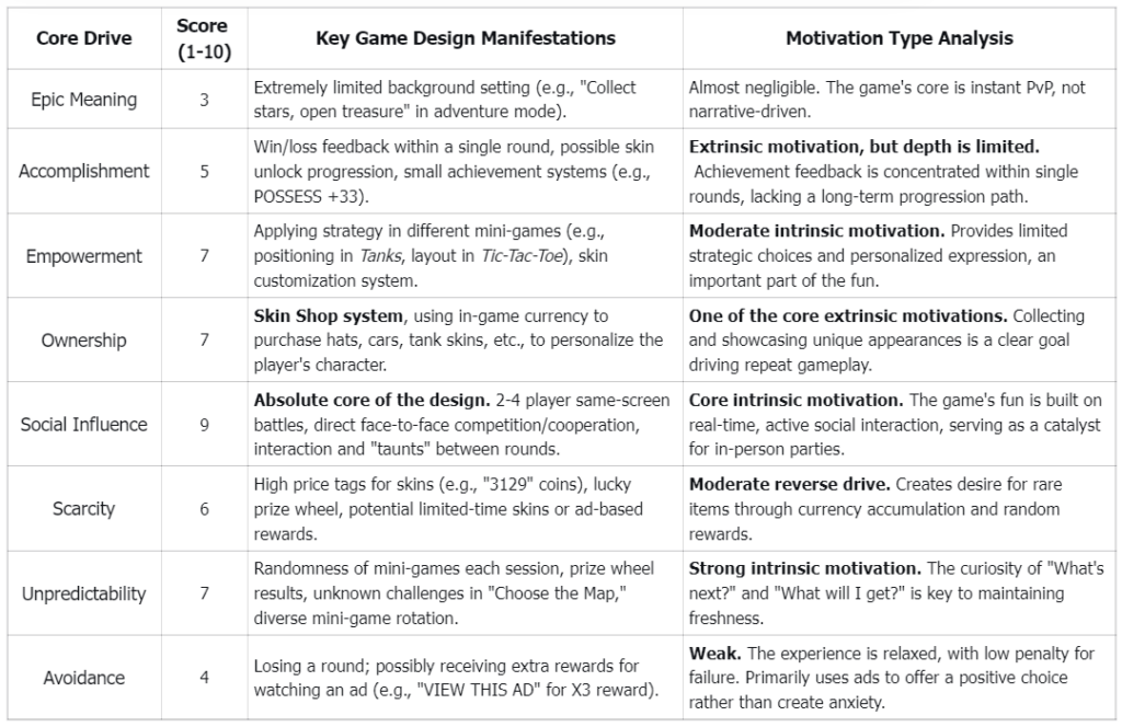 The radar chart clearly shows the game’s design focus heavily leans towards Social Influence and Unpredictability, while other motivational drives are generally weaker, especially long-term goal and progression systems. This accurately reflects its positioning as a “play one round, done” party game.