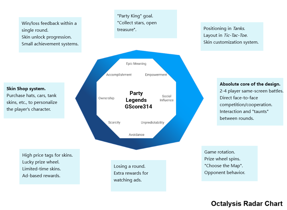 Party Legends: 234 Mini Battle is a brilliantly “toy-like” game. In the Octalysis analysis, its exceptionally strong Social drive is precisely what defines it. It doesn’t chase complex personal progression or epic stories, but focuses purely on facilitating fun within a social circle—and in this, its design is precise and effective.